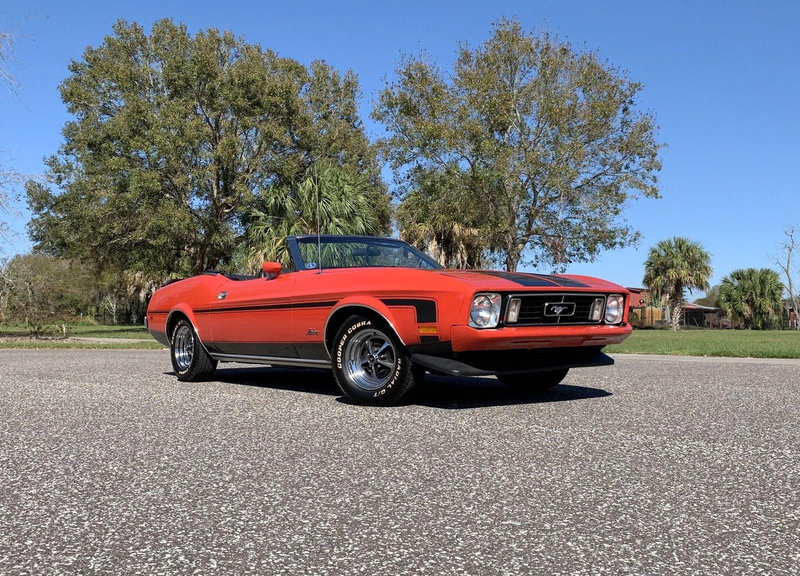 We are pleased to offer this 1973 Ford Mustang Convertible,with its numbers-matching 302 V8 and C4 automatic transmission. Equipped with power steering, power disc brakes, and 14” Magnum 500 wheels with Cooper white letter tires, this Mustang delivers both style and drivability. Finished in bright red with a black stripe package, rear deck spoiler, and black power convertible top with boot, it has a true muscle car presence. The interior features black knitted vinyl bucket seats, floor shifter, and AM/FM/Cassette radio, along with the original owner’s manual. A clean, well-kept classic Mustang, ready to cruise and enjoy.