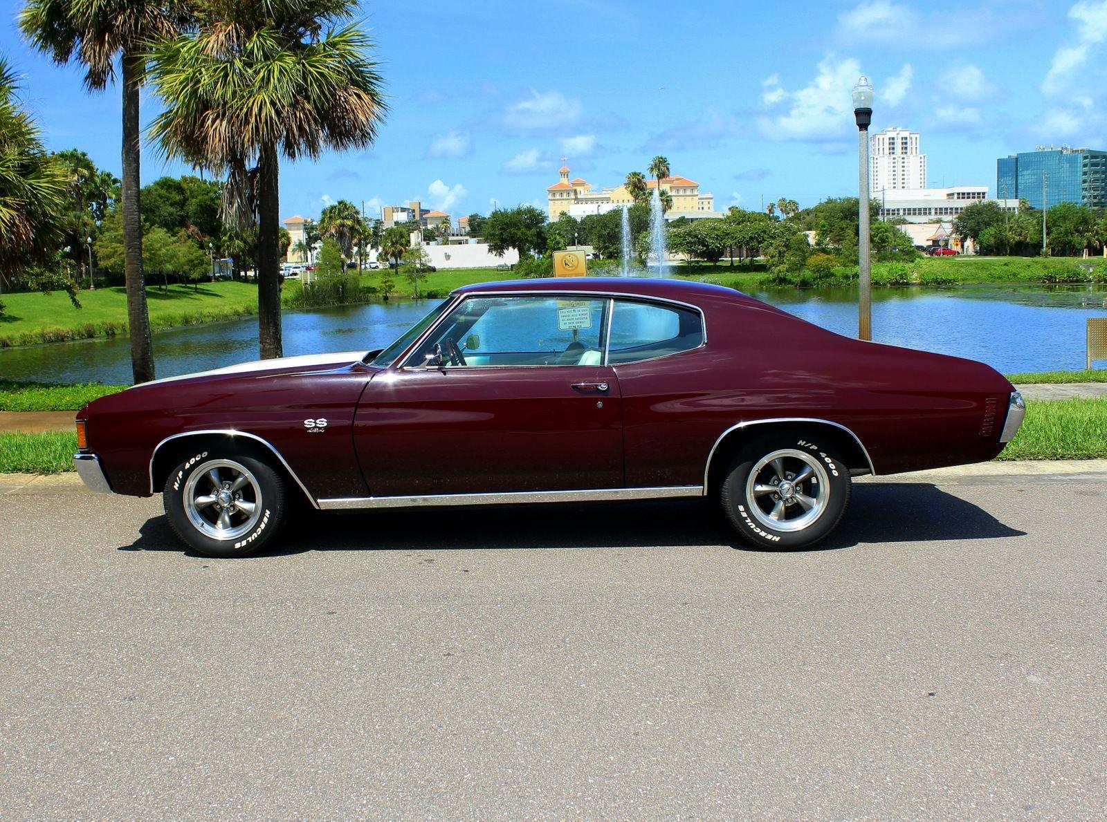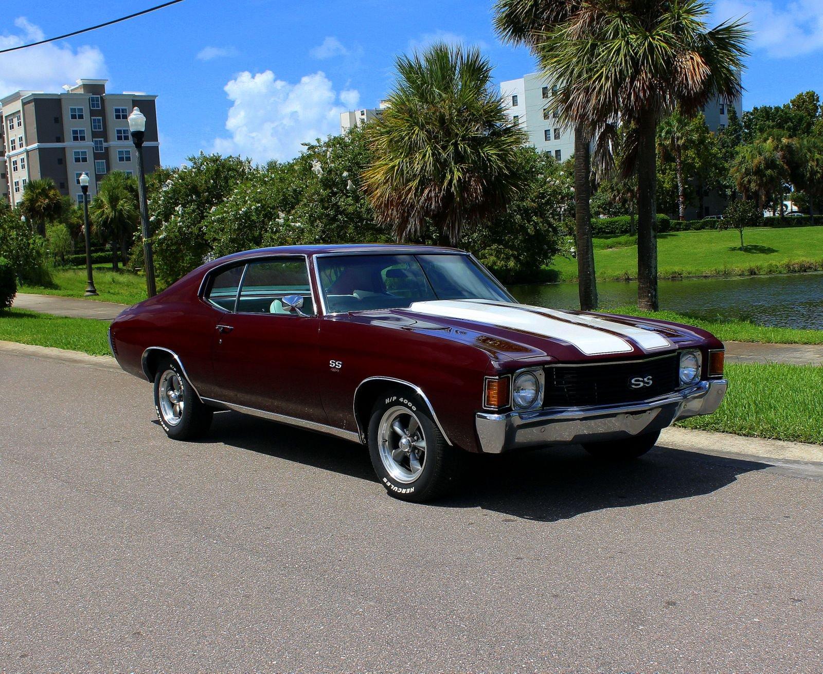 1972 Chevy Chevelle for Sale. Powered by a 454 CI V8 with an Edelbrock Intake, 4 barrel carb, and headers into throaty dual exhaust that create the unmistakable sound of a BIG BLOCK Chevy! It's backed by an automatic transmission, power steering, power disc brakes, and Vintage Air Conditioning. Neat and detailed engine compartment. The contrasting white bucket seat interior, center console, tilt steering column, and wood grain steering wheel all add to the car's appeal. A bold SS stripe package along with badging will turn heads as you rumble past! The car rolls on a set of silver gray metallic alloy 5 spoke rims carrying Hercules HP 4000 raised white letter radials in 215/65R 15's. Chevelles are one of the most popular Classic Cars right now! This Big Block Chevy will provide countless hours of cruising and will be a hit at any car show it attends!