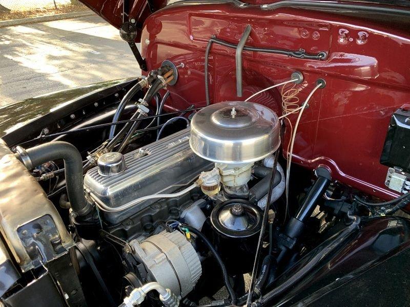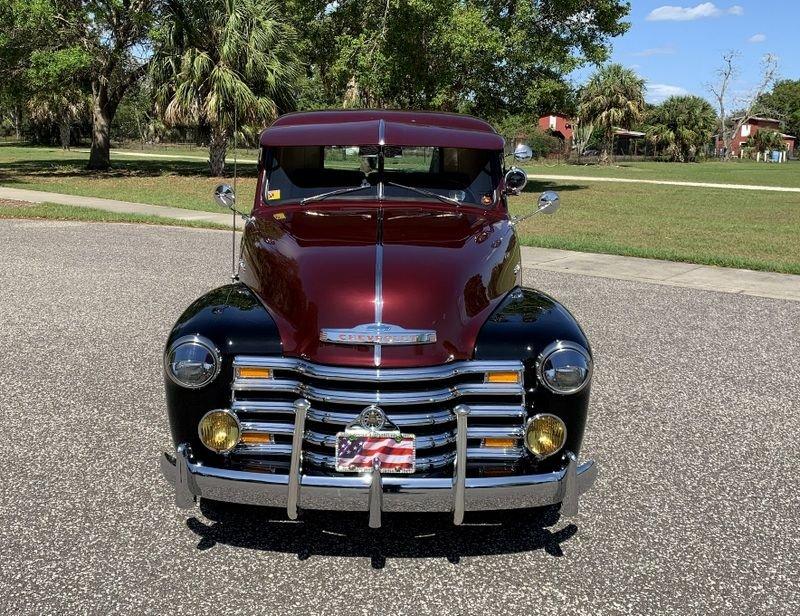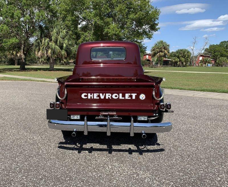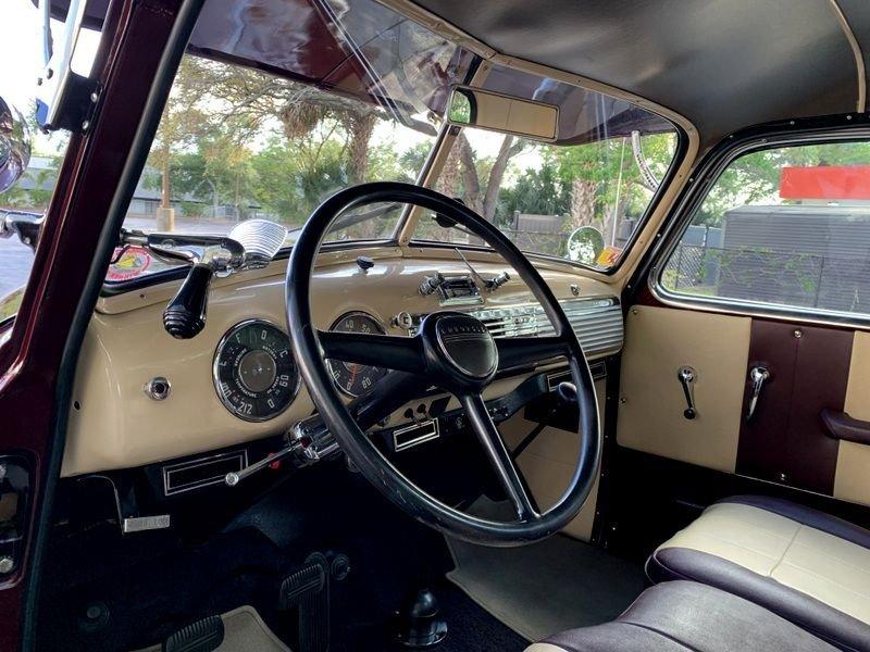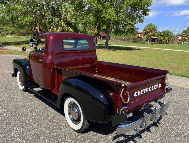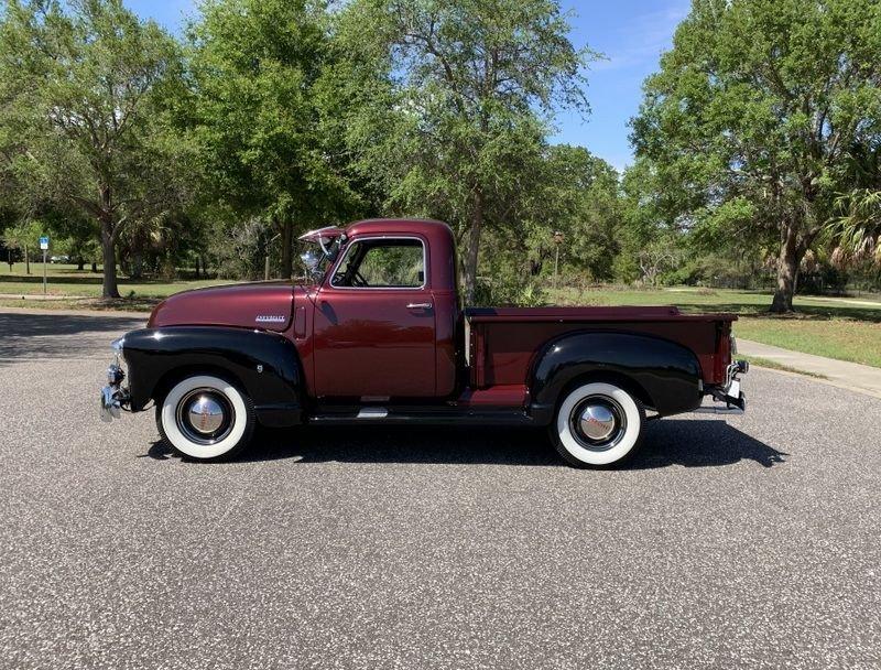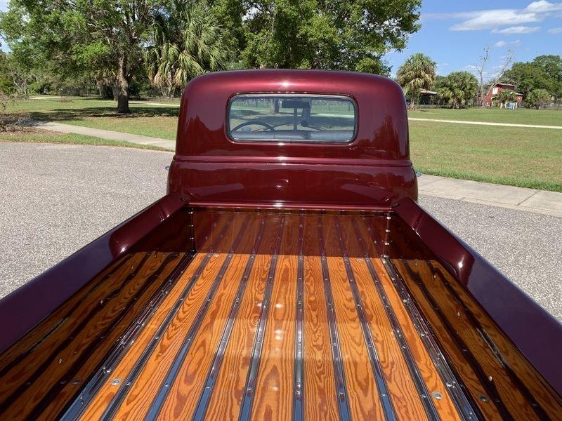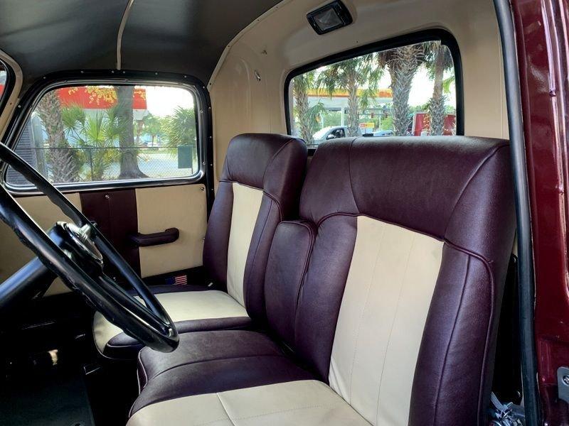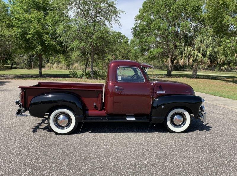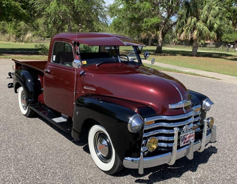 We are pleased to offer this 1948 Chevrolet 3100 Pickup for Sale. Powered by an Inline 6 cylinder engine, Fenton split exhaust manifold with dual exhaust, remote oil filter, electronic ignition, 12 volt electrical system with a Delco Alternator, updated wiring, floor shifter, 4 speed manual transmission with granny style first gear, 16” painted steel wheels with caps, pie crust style wide white wall tires, wood bed with stainless steel trim, beautiful jet black fenders with Brandy Wine body, windshield visor, halogen headlights with light visors, upgraded turn signals and exterior lighting, working fog lights, split front windshield, replacement glass, dual cowl mount mirrors and door frame mirrors, vinyl split bench seat interior, stock steering column, painted dash, air conditioning, working factory style gauges, upgraded AM/FM/Cassette radio, upgraded electronic wipers.