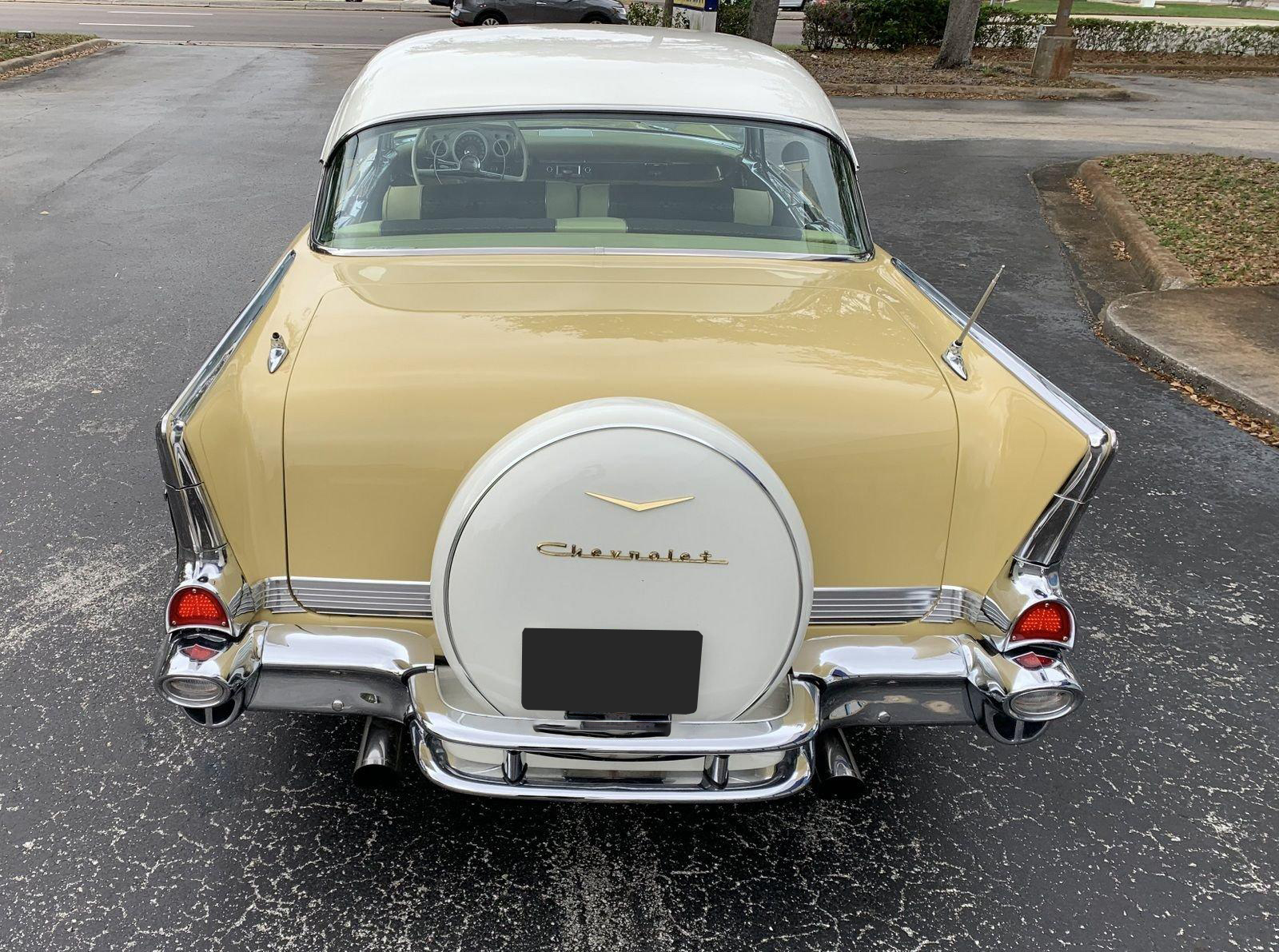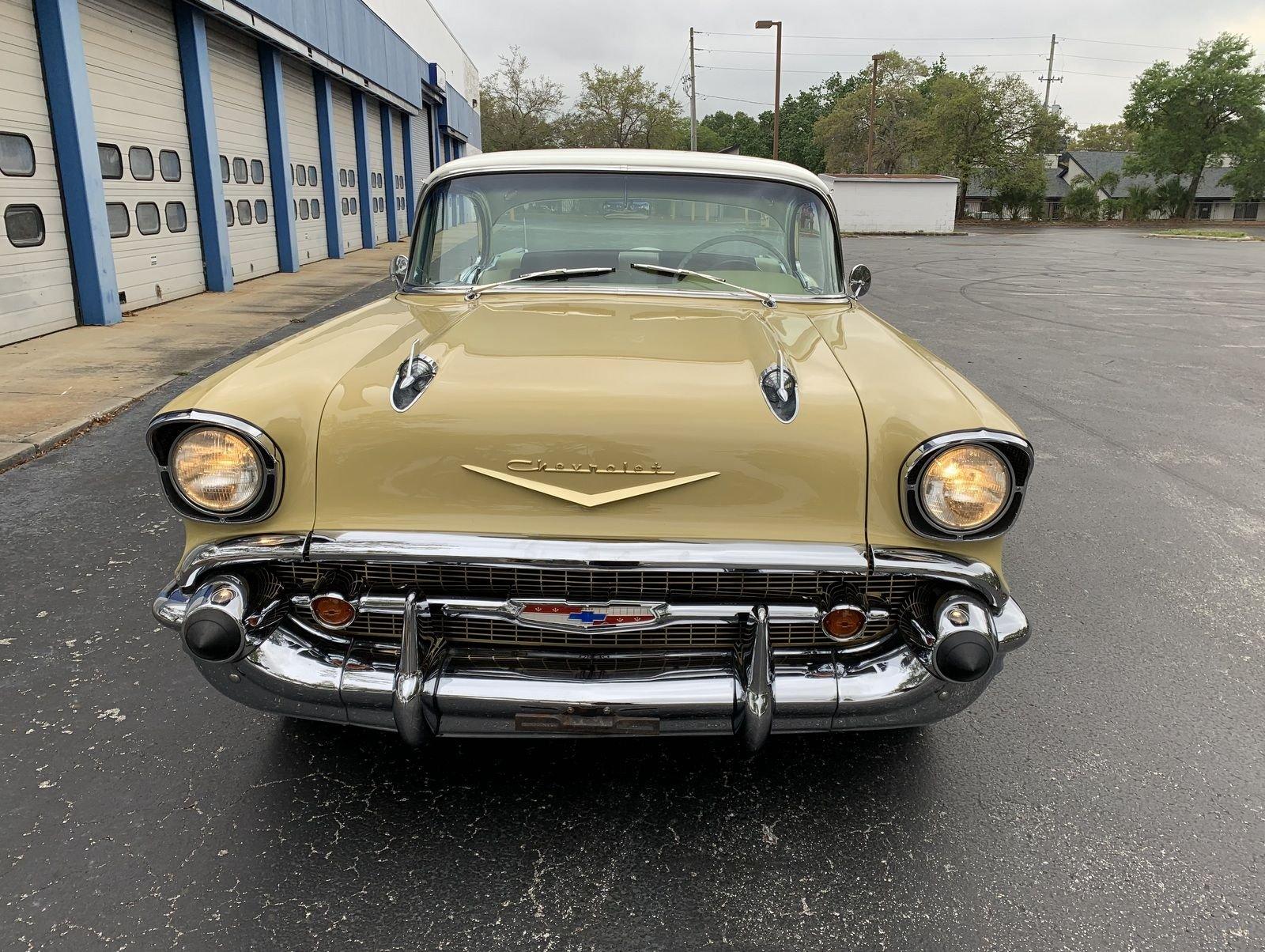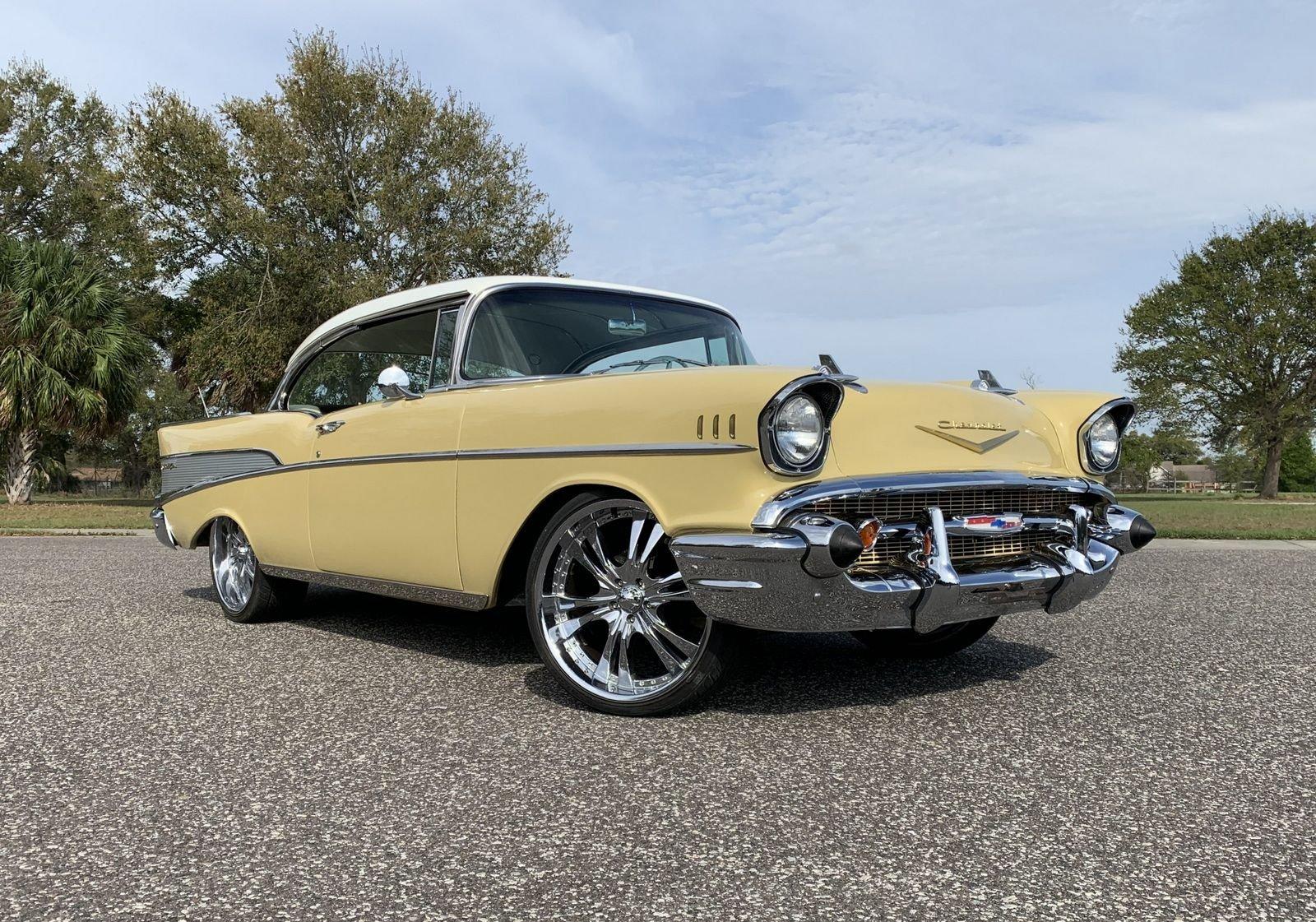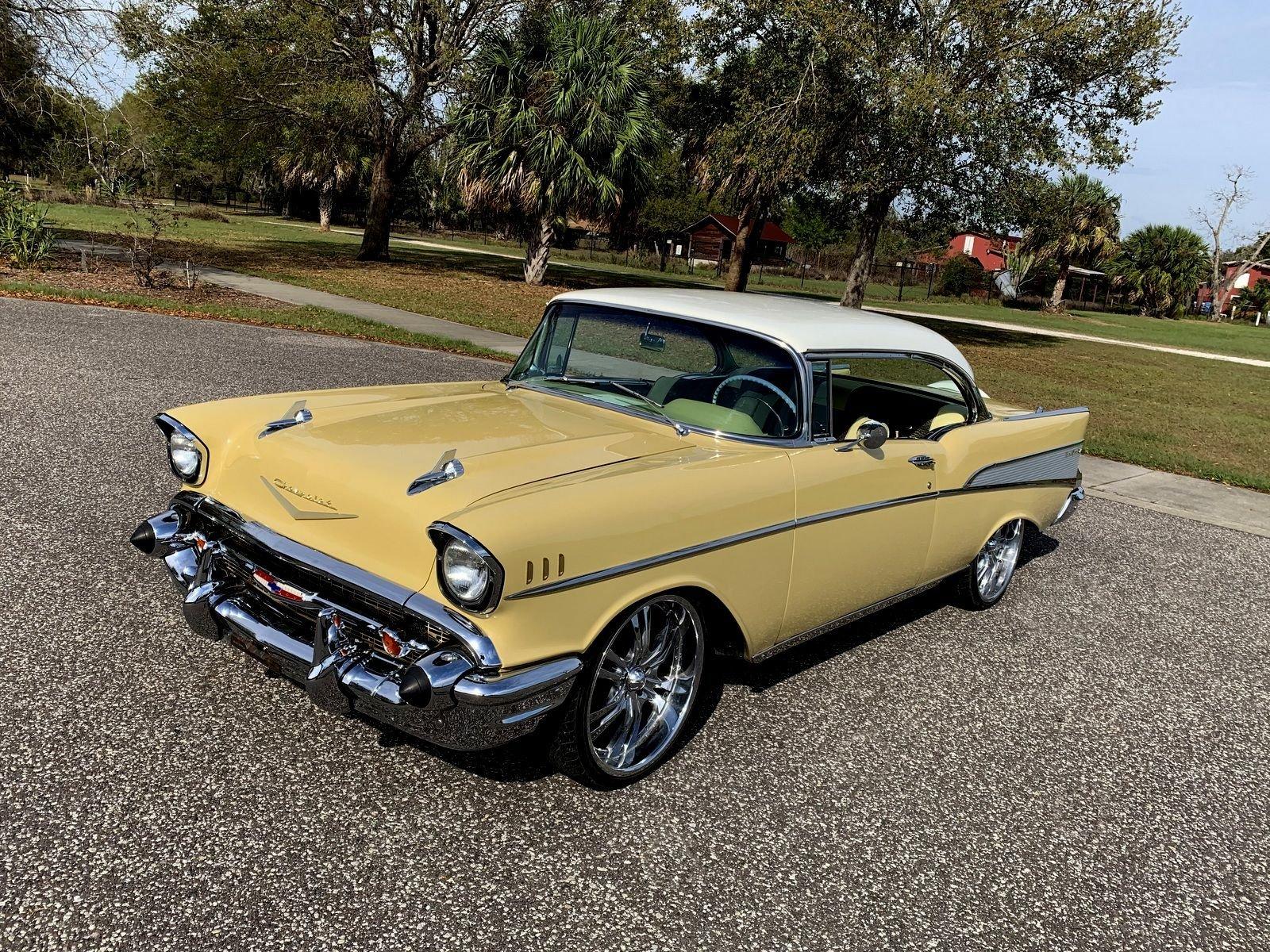 We are pleased to offer this 1957 Chevrolet Bel Air Hardtop for Sale. 350 Cu In V8 engine block, 4 barrel carburetor, chrome engine accessories, dual exhaust, automatic transmission, air conditioning, power disc brakes, power steering, 20” chrome plated alloy wheels, eye catching two tone paint, dual chrome sport mirrors, factory style bench seat interior, floor shifter, GPS speedometer, auxiliary gauges, upgraded radio.