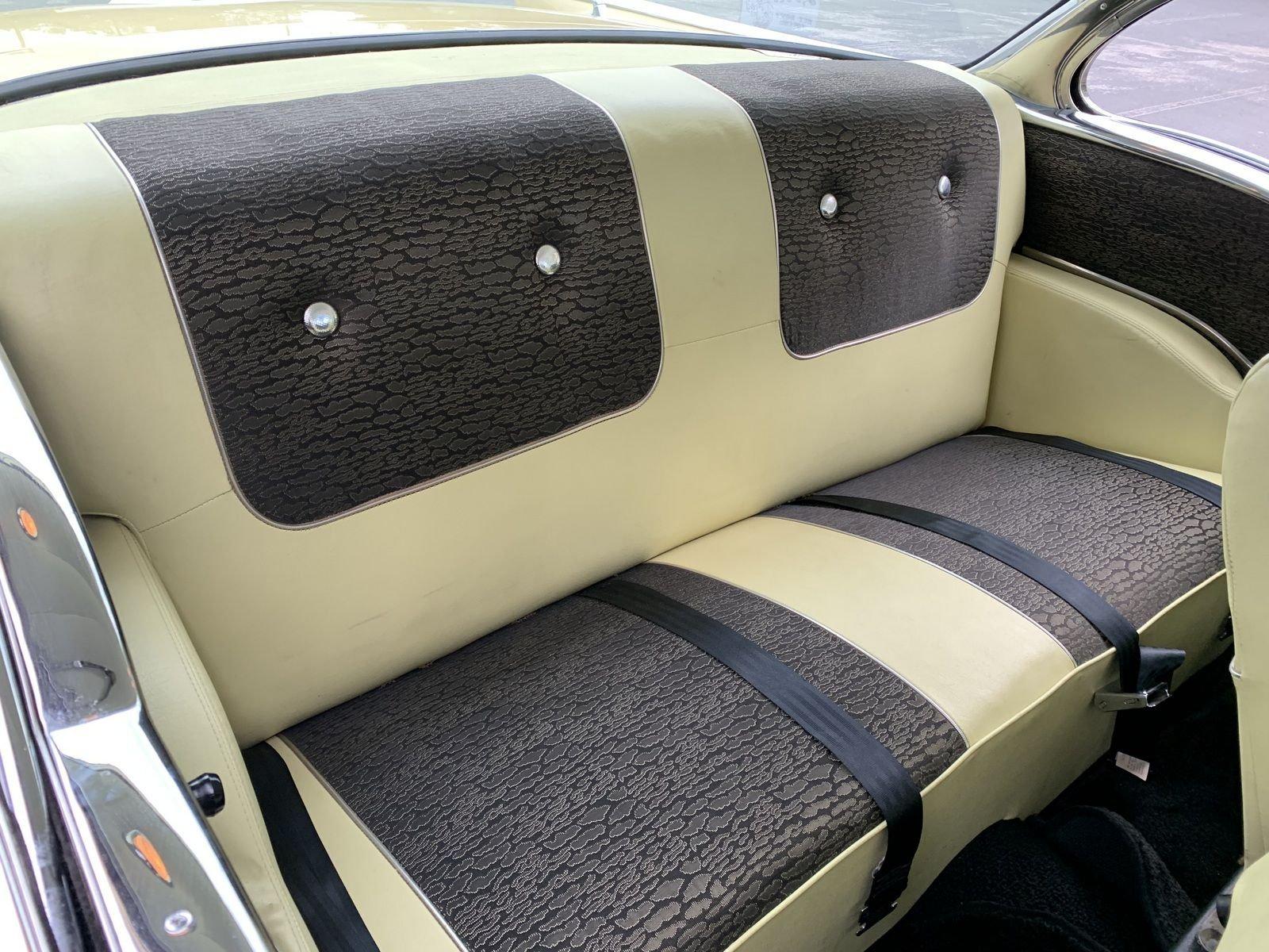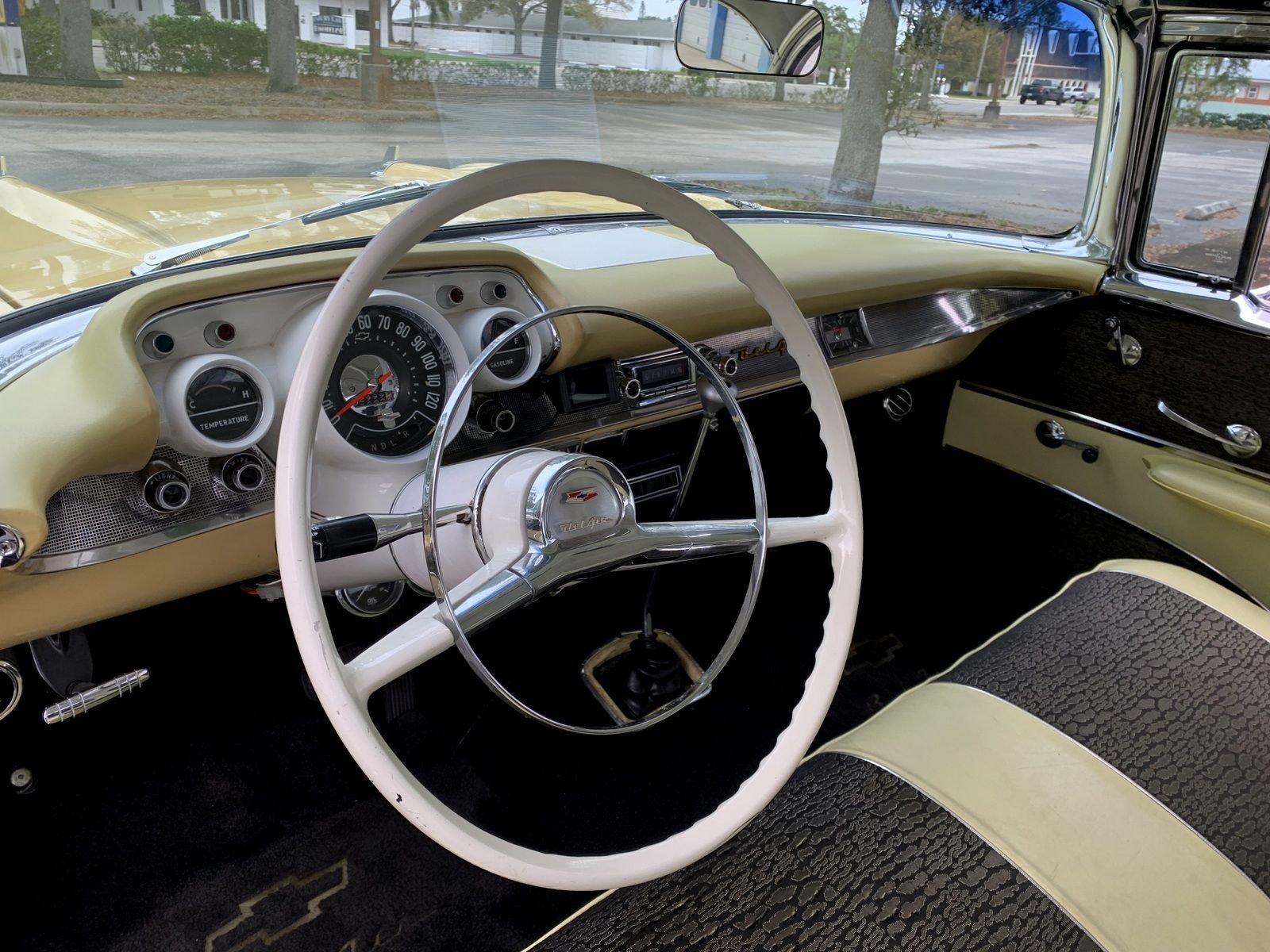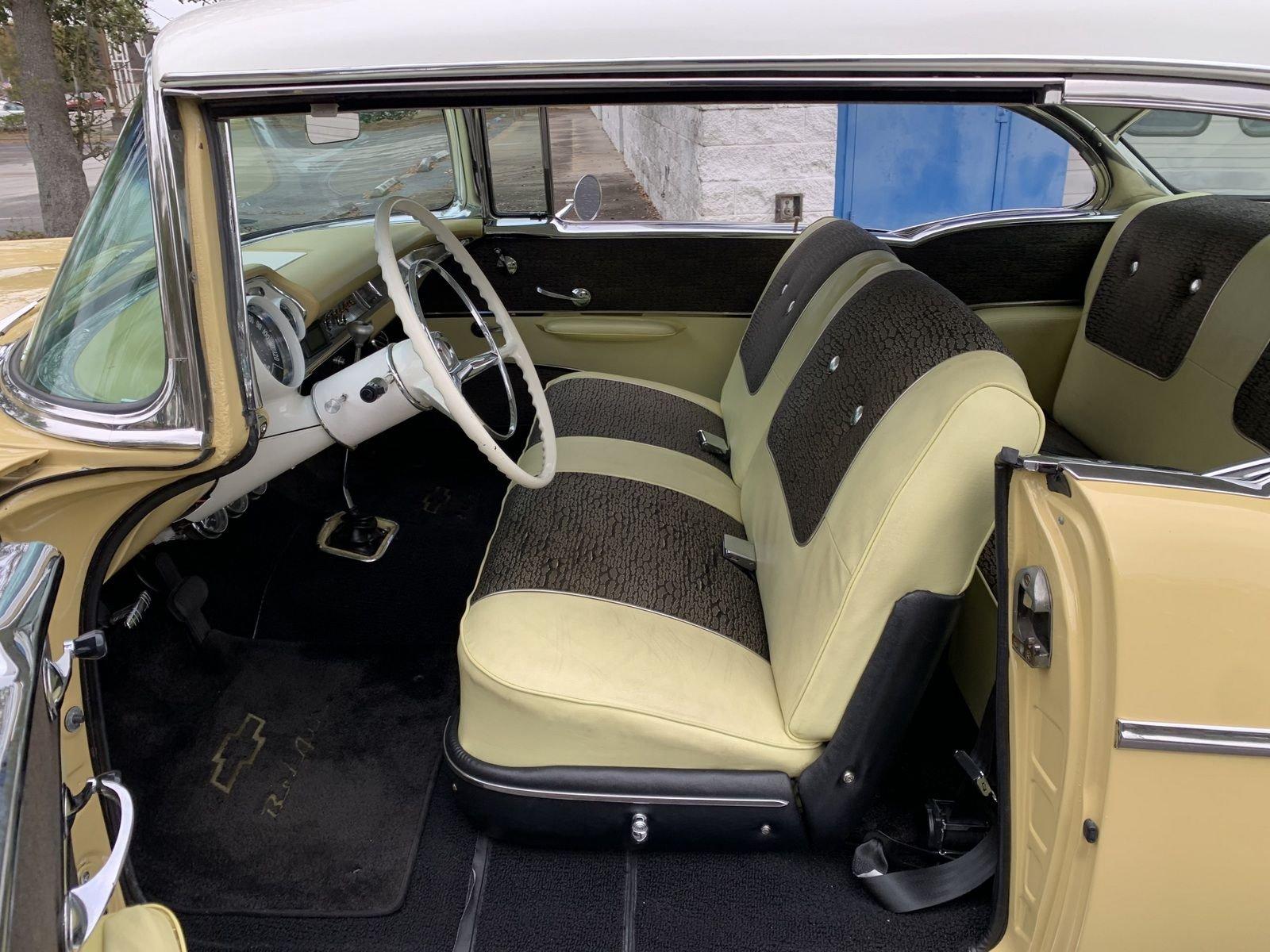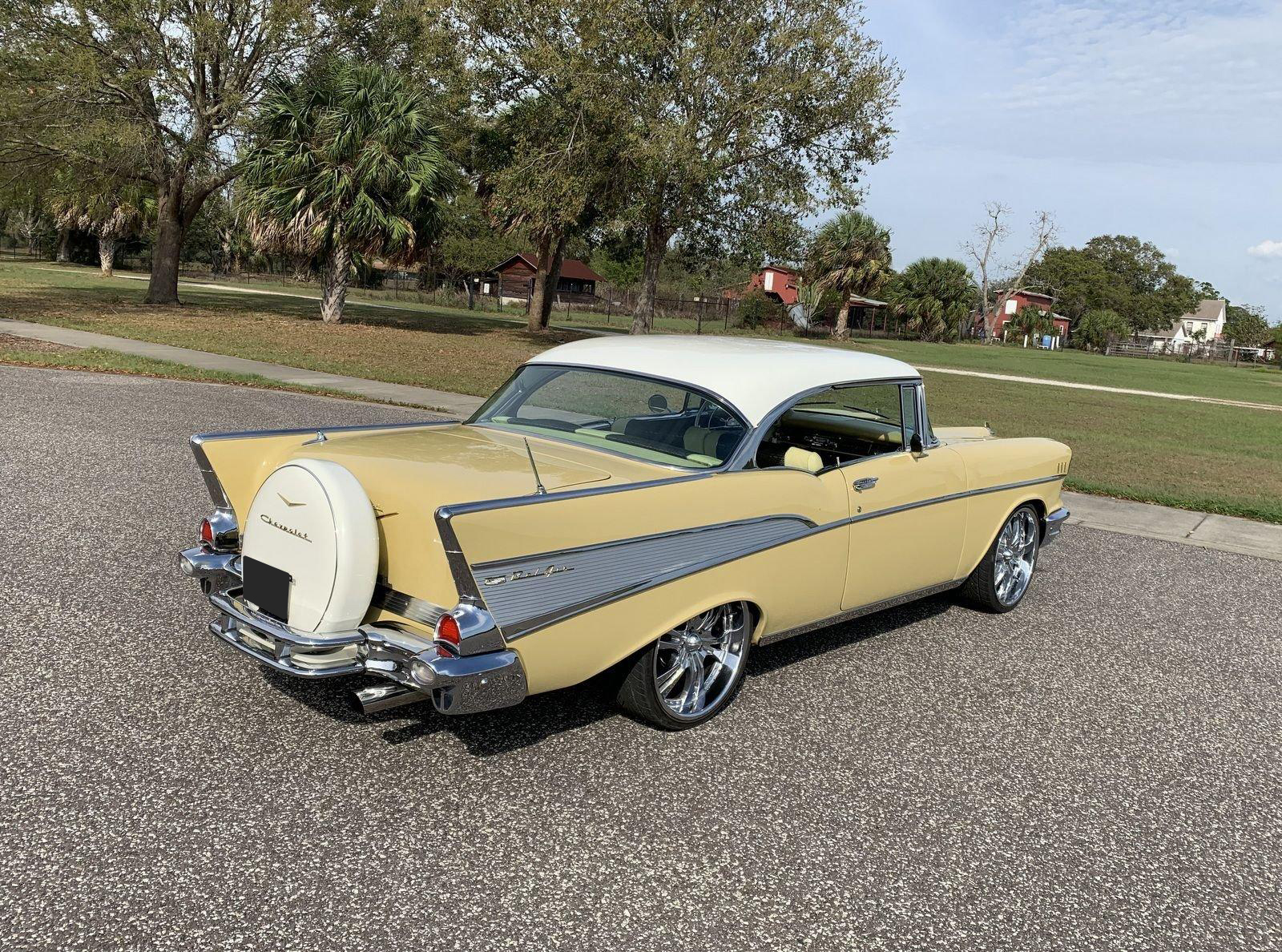 We are pleased to offer this 1957 Chevrolet Bel Air Hardtop for Sale. 350 Cu In V8 engine block, 4 barrel carburetor, chrome engine accessories, dual exhaust, automatic transmission, air conditioning, power disc brakes, power steering, 20” chrome plated alloy wheels, eye catching two tone paint, dual chrome sport mirrors, factory style bench seat interior, floor shifter, GPS speedometer, auxiliary gauges, upgraded radio.