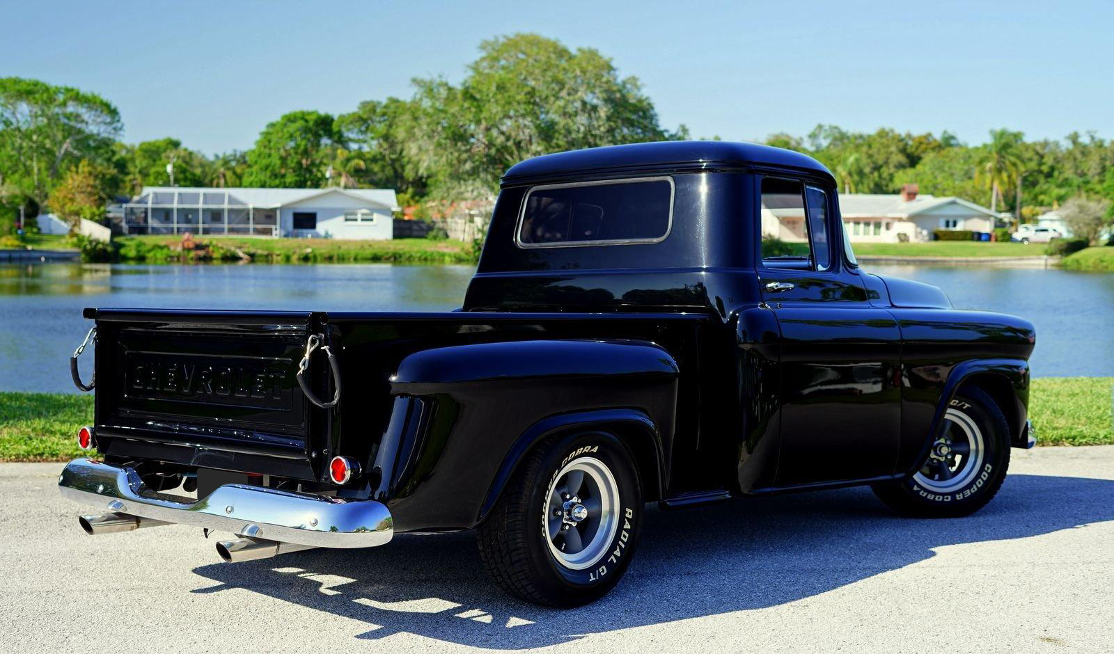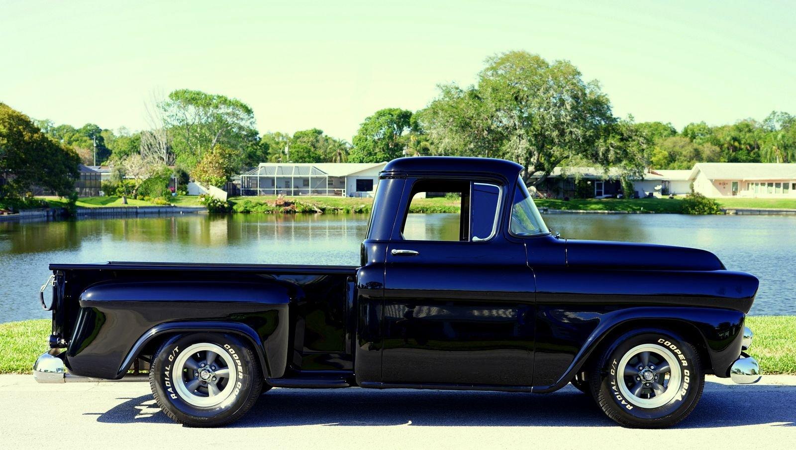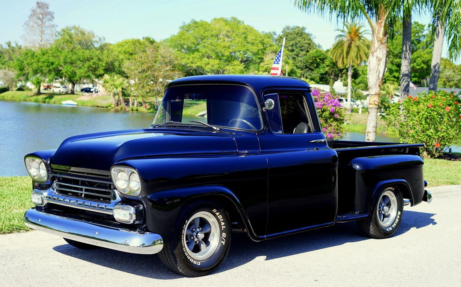 We are pleased to offer this 1958 Chevrolet Apache Pickup Truck for Sale. 350 Cu In V8 engine, Demon 4 barrel carburetor, air gap aluminum intake, electronic ignition, dual exhaust with electric cutouts, 700R4 overdrive transmission, upgraded front suspension with rack and pinion power steering, 4 wheel disc brakes, 9 inch rear with a 3.00 posi gear, 15” American Racing Torque Thrust D Wheels with Cooper white letter tires, stunning jet black paint job on an incredibly strait Pickup Body, step side bed, wood bed floor, driver's chrome mirror, tinted glass, black bench seat interior, tilt steering column, VDO Gauges, Lokar Shifter, under dash air conditioning, electric wipers.