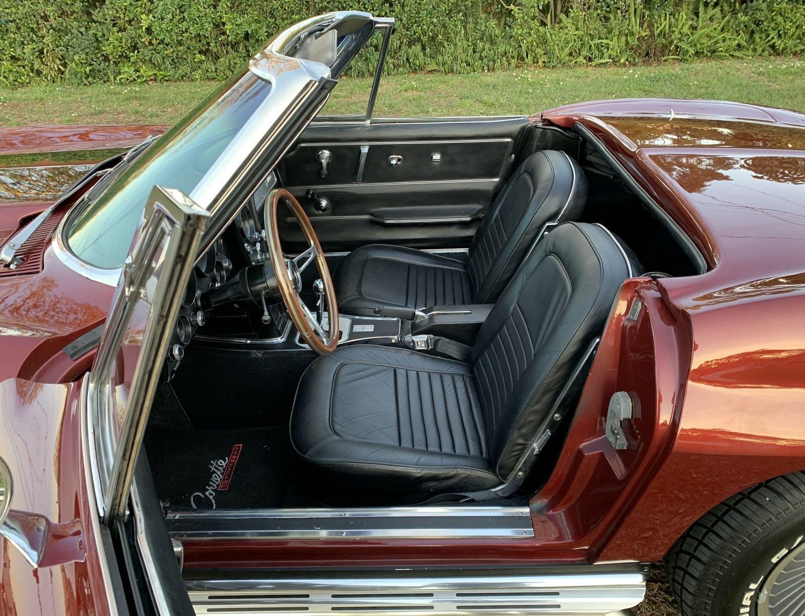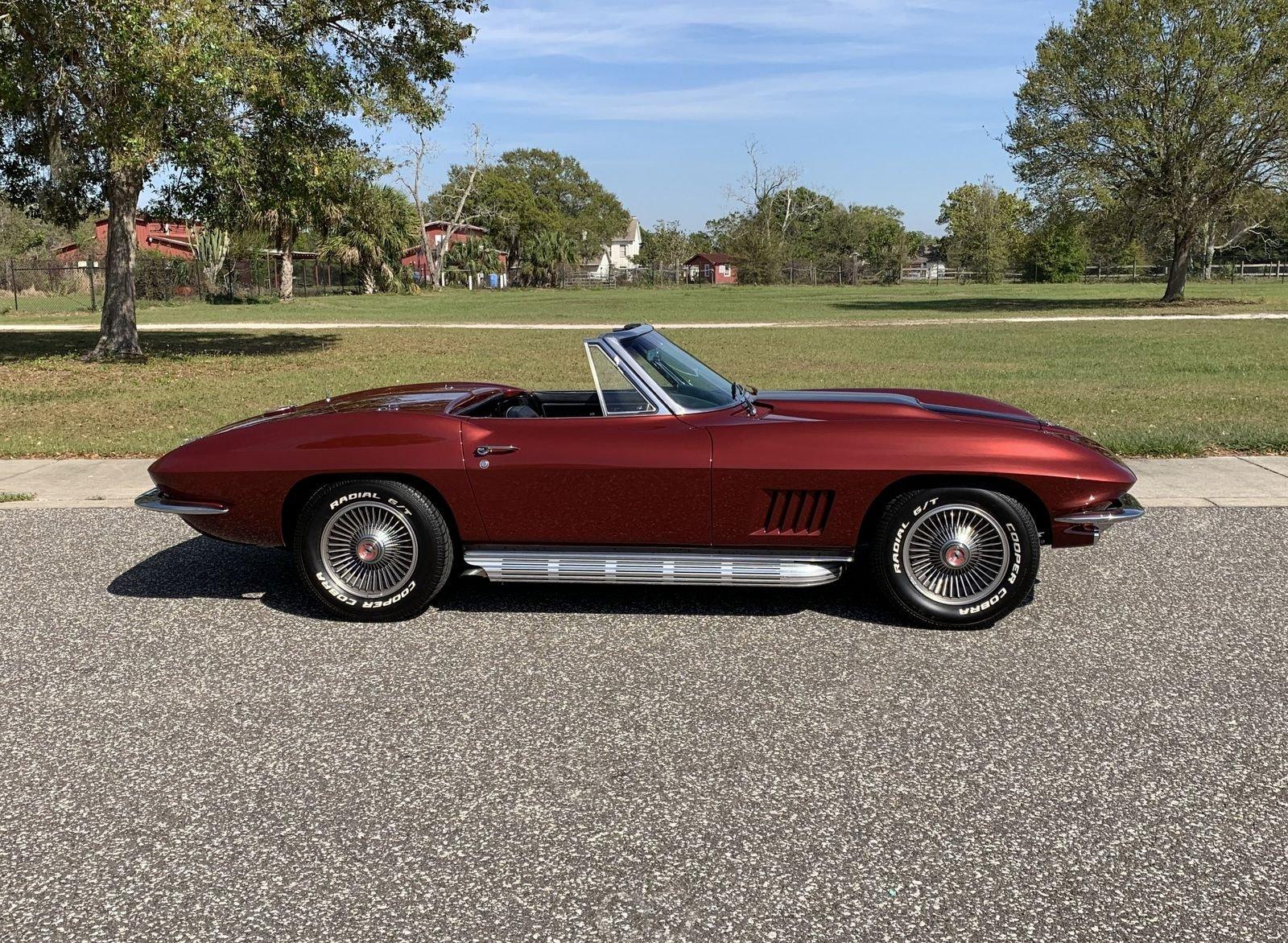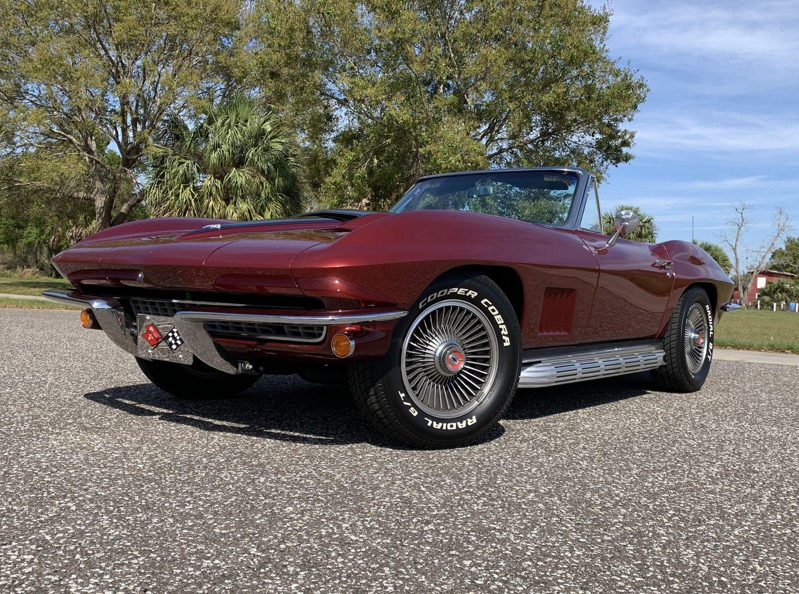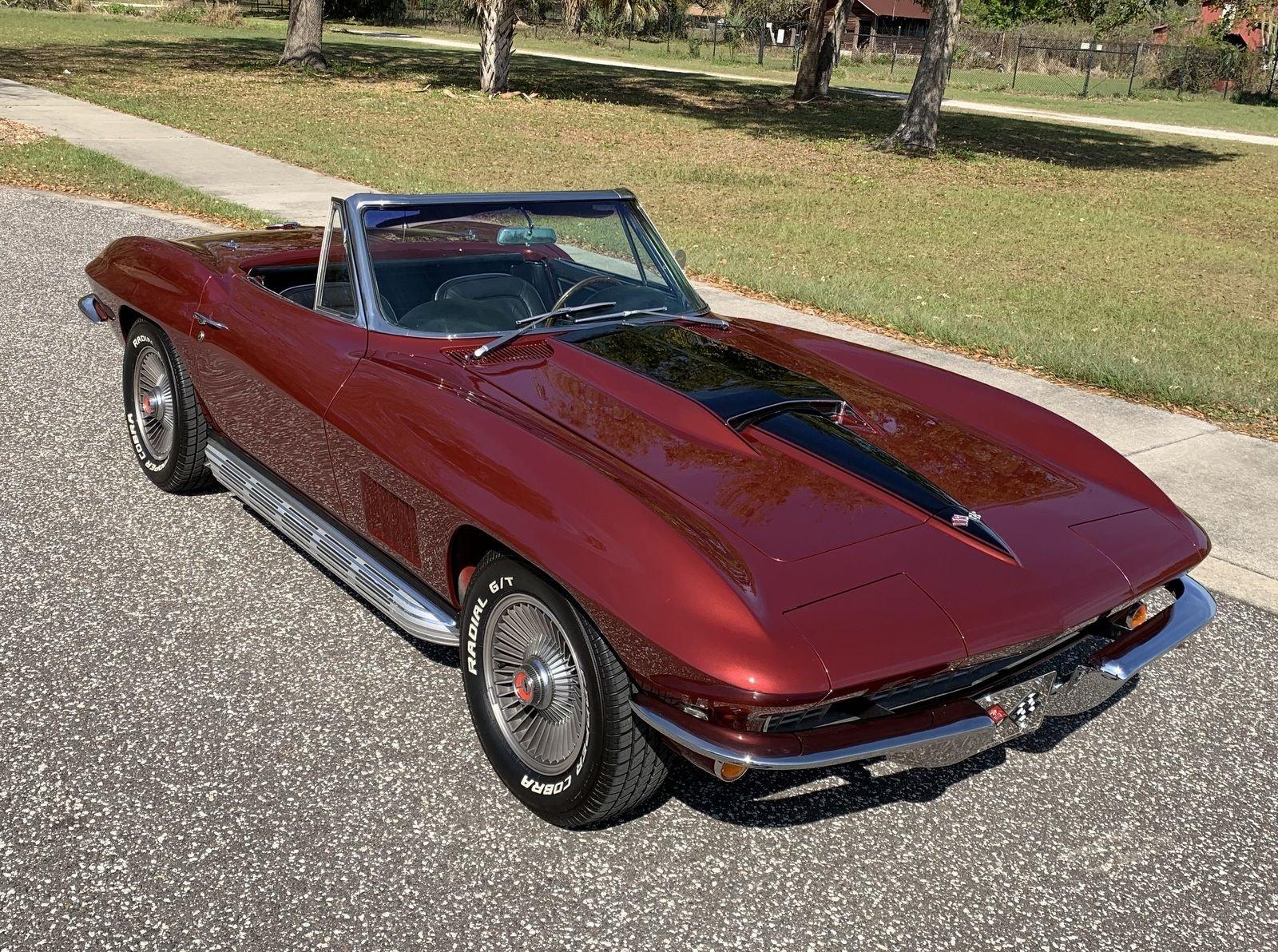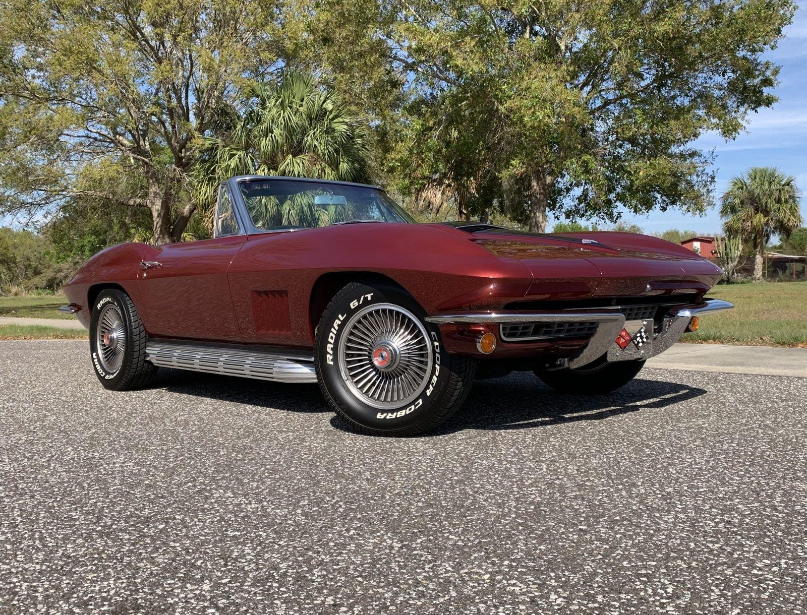 We are pleased to offer this 1967 Chevrolet Corvette Roadster for Sale. 327 HC Suffix Code engine block rated at 300 horsepower, Holley 4 barrel carburetor, HEI electronic ignition, side exhaust, numbers matching Muncie 4 speed manual transmission, 4 wheel disc brakes, 15” bolt on alloy wheels, Cooper white letter radial tires, refinished in Milano Maroon metallic, Stinger Hood with stripe package, working electric headlights, driver's chrome sport mirror, black convertible top, black bucket seat interior, 3 spoke wood trim steering wheel, beautiful gauge package, updated AM/FM radio.